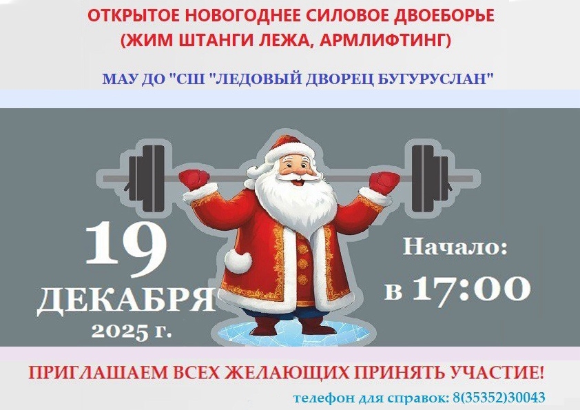 19 декабря в МАУ ДО «СШ «Ледовый дворец Бугуруслан» состоялись праздничные соревнования по пауэрлифтингу — Открытое новогоднее силовое двоеборье (жим штанги лежа и армлифтинг)